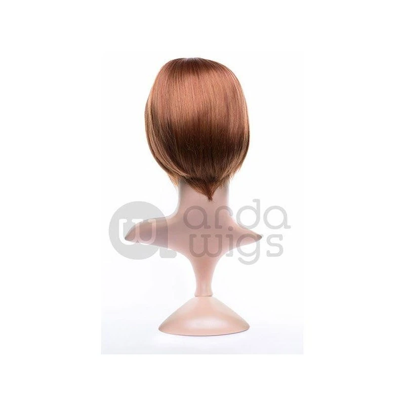An extra-short feathered and layered bob with blunt cut bangs. Includes a 1″ (2.5 cm) skin top and makes a great base for our ponytail clips! Measures 7″ (18 cm) from crown to bangs and 10″ (30.5 cm) from crown to sides and crown to back. The sides in front have very small tails extending about 11″ (28 cm) from crown to ends.